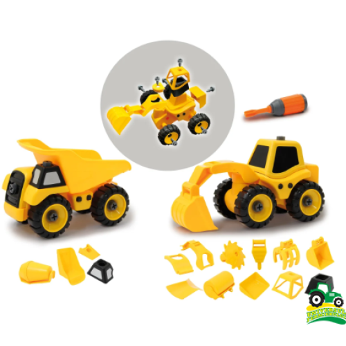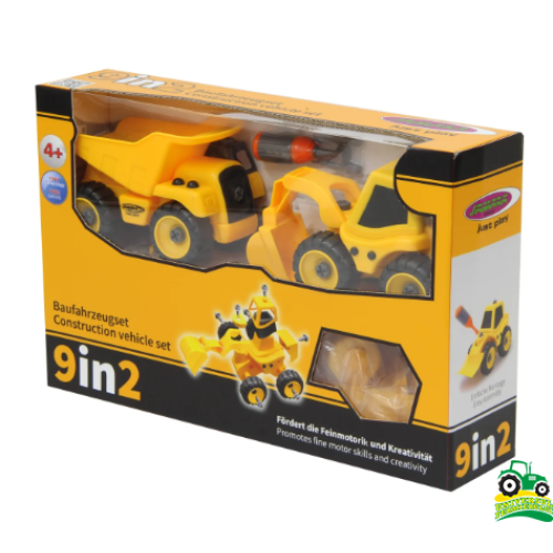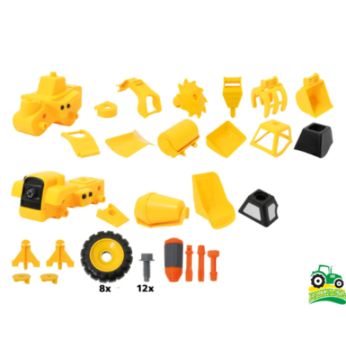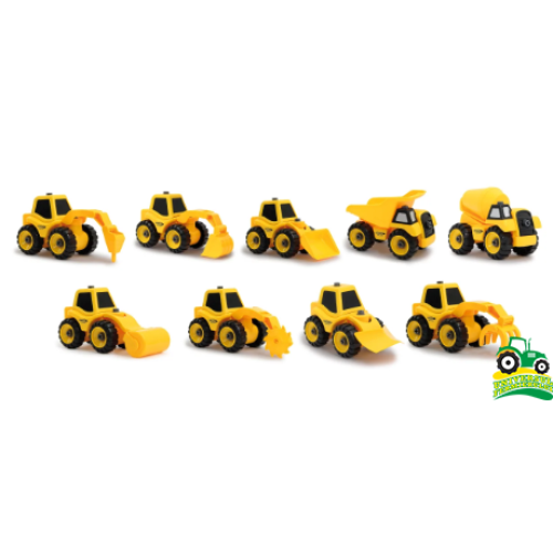 Setul conține 9 vehicule de construcții diferite ce pot fi ansamblate, fiecare inspirat din utilaje reale folosite pe șantiere, permițând copiilor să creeze scenarii diverse de lucru, transport și excavare.